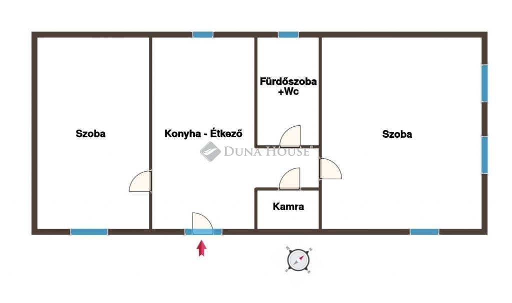 Az ingatlanban egy étkezős konyha, két különbejáratú szoba, egy fürdőszoba+wc, és egy közlekedő helyiségek kaptak helyet. Tárolás céljára egy kamra is rendelkezésre áll. Praktikus elrendezése okán optimális fiatalok, összeköltözők, idősek, kisebb családok számára is.