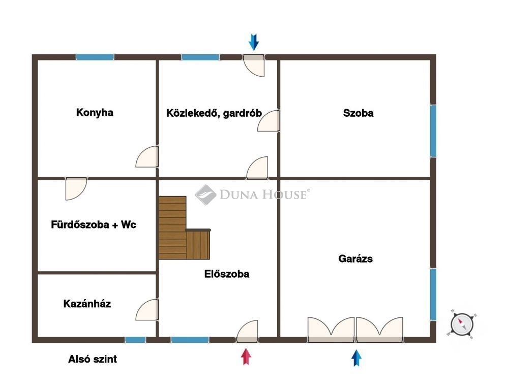 Alsó szintjén egy tágas szobával, fürdőszoba+wc-vel, étkezős konyhával, előszobával felszerelt garzonlakás található, illetve a szinten kapott helyet a kazánház, és egy lakótérhez kapcsolódó, tágas garázs is. Ennek köszönhetően hazaérkezéskor esős időben is szárazan léphetünk otthonunkba.