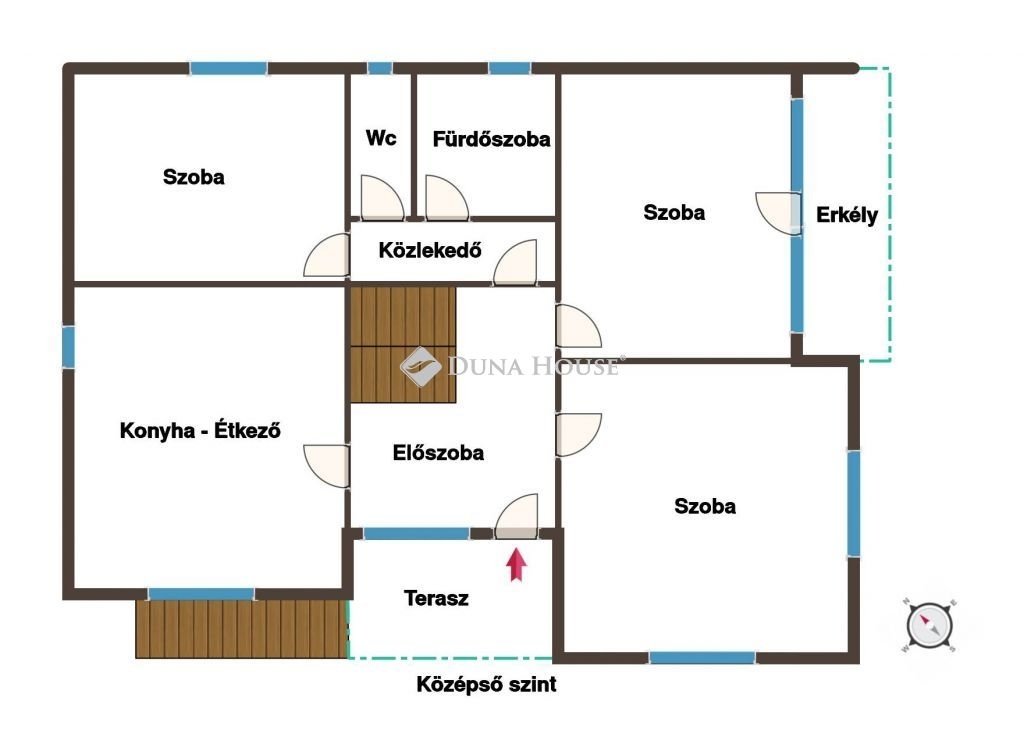 A középső szinten egy 3 különnyíló szobás lakrész található, mely étkezős konyhával, fürdőszobával, külön wc-vel, előszobával is felszerelt. Az előszobából és az egyik hálószobából egy-egy tágas erkély nyílik, melyekről kitekintve zöldre néző, hegyekre panorámás kilátásban gyönyörködhetünk.