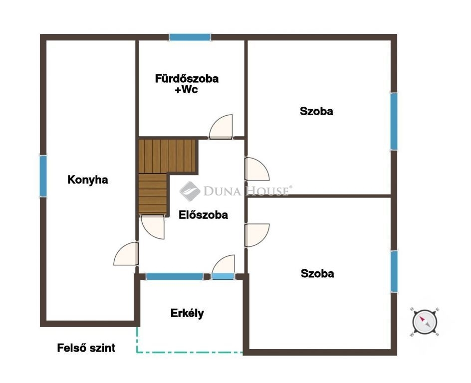 A felső szinten egy 2 különnyíló szobás lakrész kapott helyet, előszobával, konyhával, kifejezetten tágas fürdőszoba+wc-vel, illetve az előszobából megközelíthető, panorámás erkéllyel.