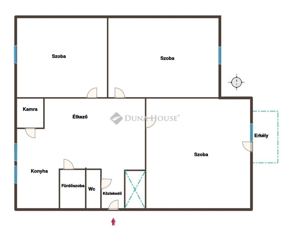 - nappali+ 2 szoba, étkező-konyha, fürdőszoba, külön wc, kamra, előszoba és erkély helyiségekből áll