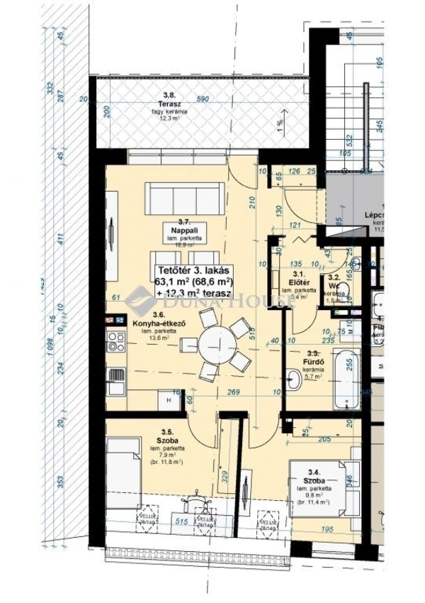 - 68,6 nm ( nettó 63,1 nm) + 12,3 nm terasz
