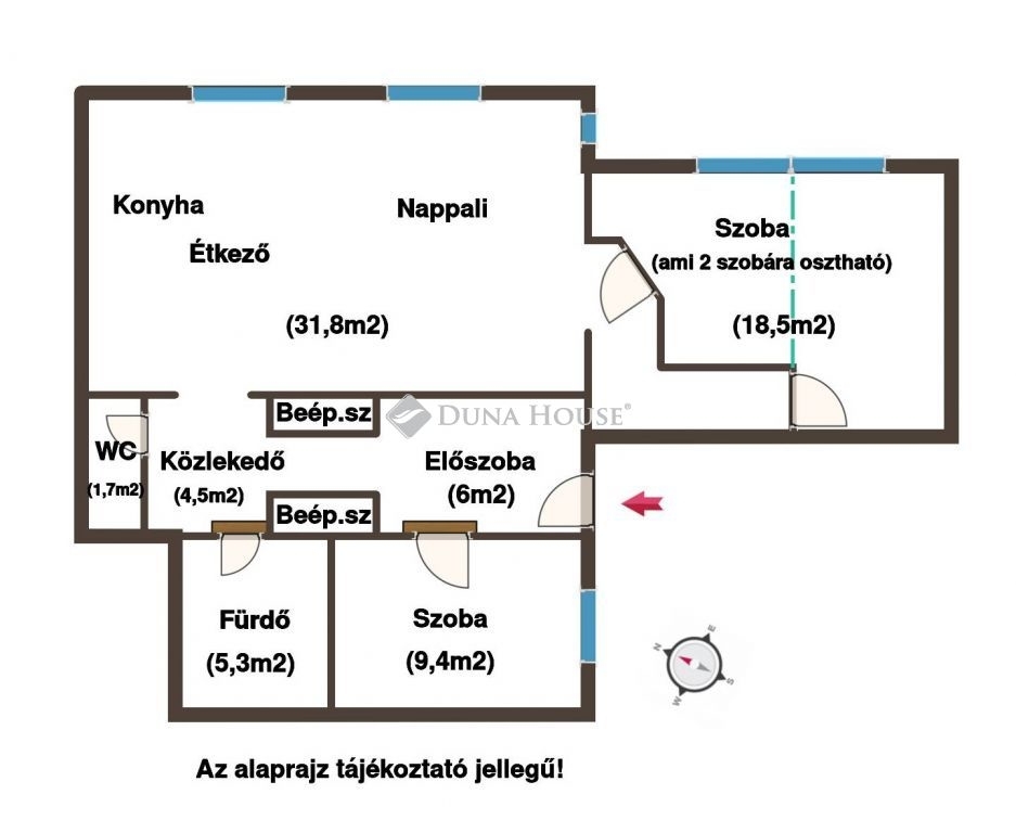 Elrendezése: amerikai nappali - konyha - étkező, hálószoba gardróbbal, egy 18,5m2-es (gyerek) szoba, ami könnyedén két szobássá visszaalakítható, továbbá előszoba, közlekedő, fürdőszoba káddal és zuhanyozóval, és külön WC.