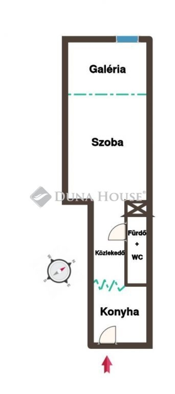 A bejárati ajtón belépve a konyhába érkezünk, innen továbbhaladva egy közlekedő vezet tovább. Jobb kézre található a fürdő WC-vel, egyenesen előre pedig a tágas szoba, amelyet galéria egészít ki, így a belmagasságot maximálisan kihasználva praktikus és otthonos megoldást kínál.