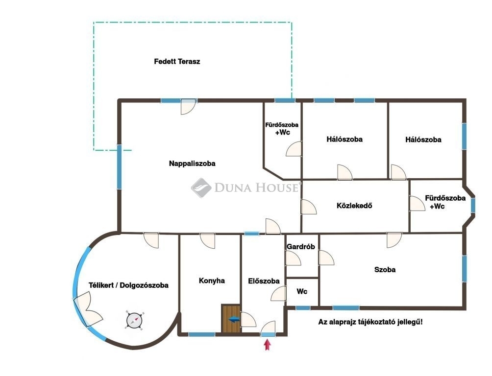 A lakótérben egy hatalmas nappaliszoba, 3 külön bejáratú hálószoba, egy hangulatos télikert (fűtött, szobaként szintén remekül használható), két fürdőszoba+wc (az egyik a szülői hálóhoz csatlakozó privát fürdőszoba), egy külön wc, egy ablakos konyha, egy előszoba, és egy a helyiségeket összekötő közlekedő helyiségek kaptak helyet. A legnagyobb hálószobához gardróbszoba is csatlakozik, továbbá a helyiség konyhapulttal is felszerelt, így akár önálló apartmanként is jól használható. A nappaliszobából hatalmas, több, mint 30m2-es fedett teraszra léphetünk ki, mely szeparált, belátástól mentes pihenést kínál a nap minden szakában.