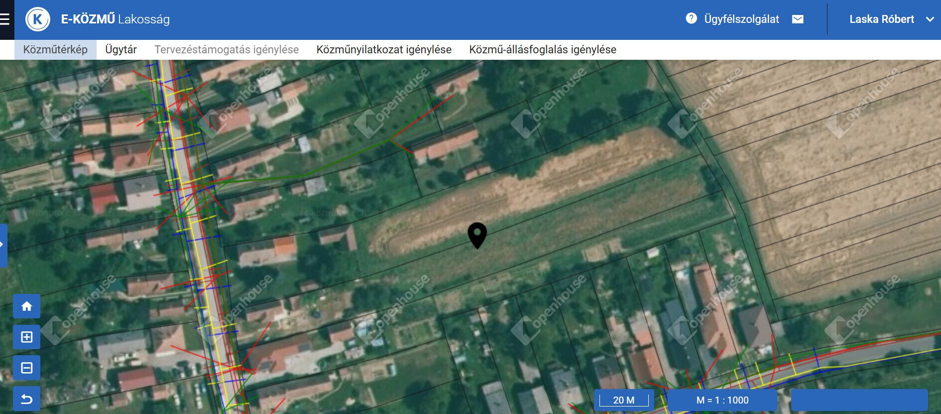 Víz, villany (1 fázis, 16 A), csatorna a házban
