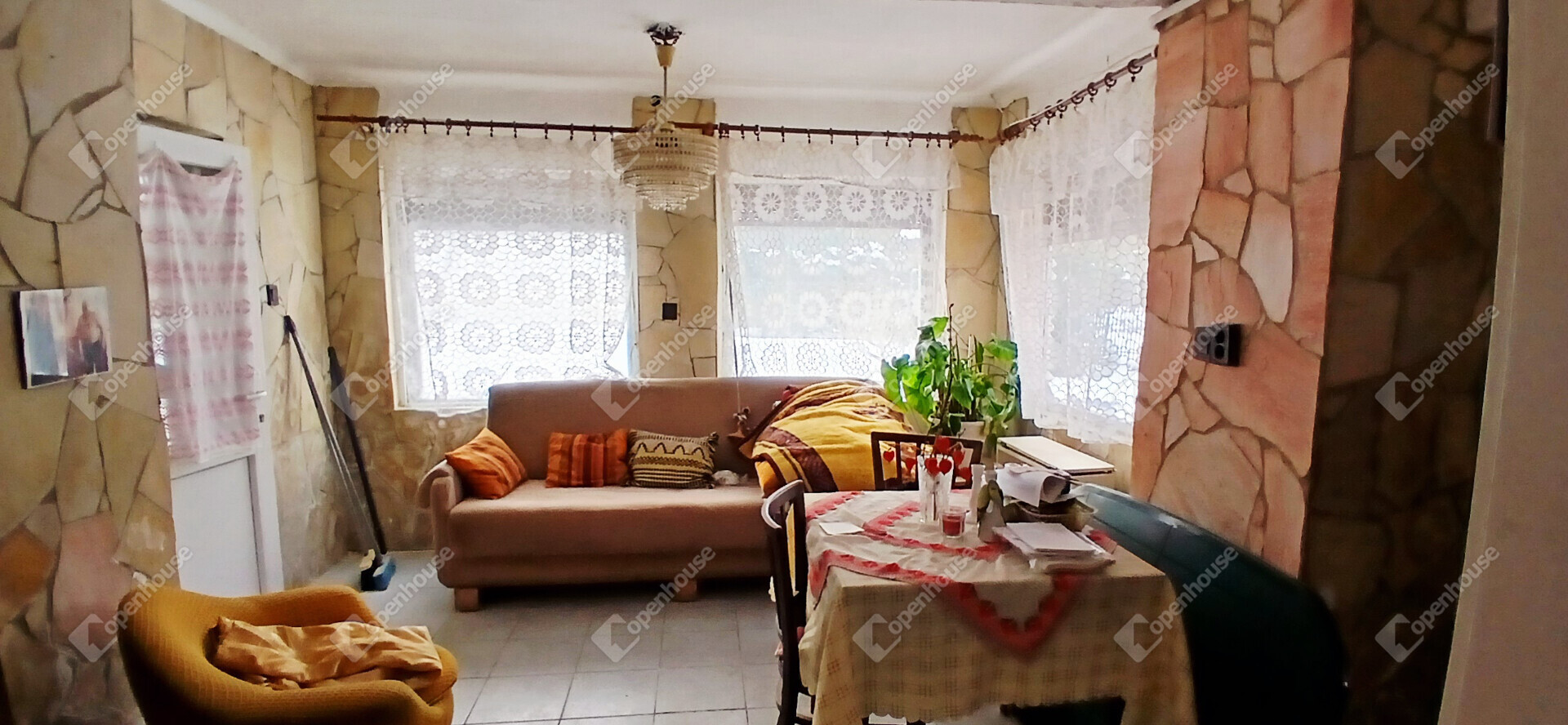 A ház elrendezése praktikus és otthonos, az előszobából a konyhába és a két szobába jutunk, a hálószobából pedig közvetlenül nyílik a tusolóval és WC-vel ellátott fürdőszoba. A stukatúr födém, a cserépfedés és a részben megmaradt eredeti fa nyílászárók a régi parasztházak varázsát idézik, miközben a laminált padló és a műanyag ablakok már a kényelmet szolgálják. A fűtésről gázkonvektor gondoskodik, de egy cserépkályha is rendelkezésre áll, amely nemcsak meleget, hanem igazi vidéki hangulatot is ad a téli estéken.